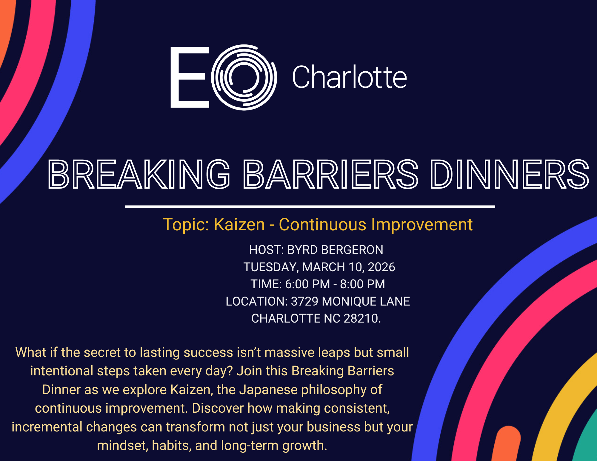 Join Byrd as she leads this upcoming Breaking Barriers Dinner on Kaizen: Continuous Improvement, guiding an intimate group of 6–8 members through an engaging conversation on how small, intentional changes can create lasting impact in both business and life.