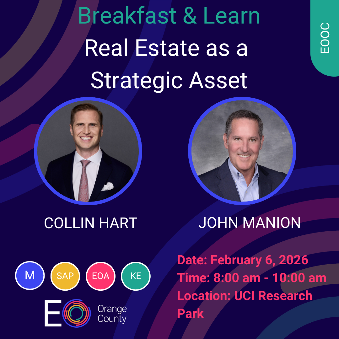 EOOC Breakfast & LearnReal Estate as a Strategic AssetPractical Fundamentals for Business Owners and Long-Term WealthPresented by EOOC Members, Collin Hart & John ManionOpen to: EO Members, Sponsors, Accelerators, SLPs & Key Executive Program Members